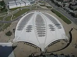 Olympic Stadium was planned to be a retractable roof stadium, the first venue of its kind in the world.[5] This ability was to come from the tower located above the stadium that would deploy when inclement weather occurred.[5] Construction on the Stadium began in November 1973 with the complete sections of the stadium being complete between May 1975 and May 1976.[5] A strike in November 1974 on stadium construction that lasted until January 1975 followed by another strike nine months later prevented completion of the tower and the retractable roof. It would result in the loss of 155 work-days at the Stadium by May 1976.[40]