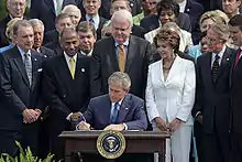 The chambers appointed a conference committee to resolve differences between the House and Senate versions of the bill. A major contention concerned the poll tax provisions; the Senate version allowed the attorney general to sue states that used poll taxes to discriminate, while the House version outright banned all poll taxes. Initially, the committee members were stalemated. To help broker a compromise, Attorney General Katzenbach drafted legislative language explicitly asserting that poll taxes were unconstitutional and instructed the Department of Justice to sue the states that maintained poll taxes. To assuage concerns of liberal committee members that this provision was not strong enough, Katzenbach enlisted the help of Martin Luther King Jr., who gave his support to the compromise. King's endorsement ended the stalemate, and on July 29, the conference committee reported its version out of committee.[15]:166–167 The House approved this conference report version of the bill on August 3 by a 328-74 vote (Democrats 217-54, Republicans 111-20),[42] and the Senate passed it on August 4 by a 79-18 vote (Democrats 49-17, Republicans 30-1).[15]:167[43][44] On August 6, President Johnson signed the Act into law with King, Rosa Parks, John Lewis, and other civil rights leaders in attendance at the signing ceremony.[15]:168