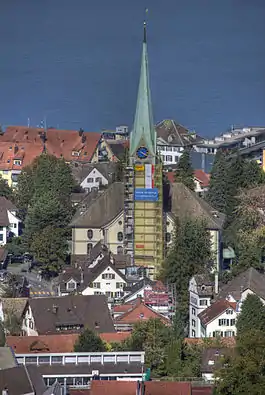 Wädenswil, locally often called Wädi or Wädischwil, is a municipality in the district of Horgen in the canton of Zürich in Switzerland. The population, as of 2013, was about 21,000.[3] On 1 January 2019 the former municipalities of Hütten and Schönenberg were merged into the municipality of Wädenswil.