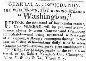 On June 19, 1851, Captain Murray was reported to have "arrived with his iron, steam propeller" apparently the Washington.[15] Murray was reported to be confident of navigating to Salem at any time of the year.[15] The arrival of the new steamer was praised by the editor of the Oregon City weekly newspaper, Oregon Spectator as a sign of progress.[15]