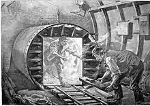 Driving the running tunnels started in November 1894, using the Greathead system of shield excavation, cast iron segment lining, compressed air working, and compressed air grouting behind the tunnel lining. 20 men worked in each heading.[10]