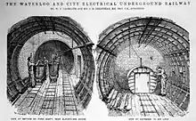 The excavated material was removed from the staging near Blackfriars Bridge; it was conveyed to there from the shields by a narrow gauge railway using electric locomotives supplied by the Siemens Company. Two were in use and a third was on order at August 1895. They operated on 18-inch (460 mm) gauge track with a twin overhead trolley wire (i.e., not using the track for current return) at 200 V DC.[10]