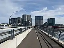 Until 2016, Wentworth Point was relatively isolated by road. Because it is surrounded by parklands in the west and south and by water in the north and east, it was only accessible by road from the rest of Sydney by two roads, Hill Road which connected it to Lidcombe, and Bennelong Parkway, which connected it to Sydney Olympic Park and the A3 arterial road. Road access was improved when the 300-metre (984 ft) Bennelong Bridge across Homebush Bay opened in May 2016, making it easier for residents to access shops and the railway station at Rhodes.[25][26] However, the bridge roadway can only be used by buses and emergency service vehicles. The bridge also includes a pathway for cyclists and pedestrians.
