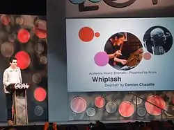Whiplash was originally planned to compete for the Academy Award for Best Original Screenplay, but on January 6, 2015, the Academy of Motion Picture Arts and Sciences (AMPAS) announced that the film would instead be competing in the Adapted Screenplay[lower-alpha 1] category[34] to the surprise of many, including Chazelle.[35] Although the Writers Guild of America categorized the screenplay as original, AMPAS classed it as an adaptation of the 2013 short version.[35]