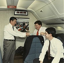 In preparation for major visits abroad and in the Oval office, as well as visits outside the United States, Martin would sometimes do the first draft of the President's weekly radio address in close coordination with Presidential chief speech writer Ben Elliott. Three of these addresses were especially important. First, Reagan's radio address in 1984 following his first meeting with a Soviet leader (Foreign Minister Gromyko) after four years in office.[15] This widely quoted radio address, highlighted in headlines on the front page of the Washington Post set the agenda and tone for the subsequent meeting with Soviet leader Gorbachev one year later. Reagan recognized Martin's role in its drafting in the following letter.[16] Second, Martin prepared a radio address describing the G-7 Economic Meeting chaired by Margaret Thatcher in 1984.[16] And third, he prepared a radio address in 1983 describing the President's visit to Japan and Korea.[16]
