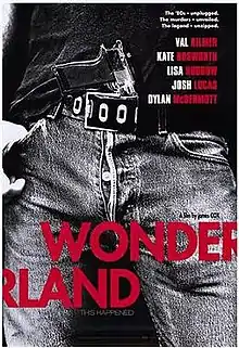 Wonderland is a 2003 American crime drama film, co-written and directed by James Cox and based on the real-life Wonderland Murders that occurred in 1981. The film stars Val Kilmer, Kate Bosworth, Dylan McDermott, Carrie Fisher, Lisa Kudrow, Josh Lucas, Christina Applegate, Tim Blake Nelson, and Janeane Garofalo. Kilmer plays the role of John Holmes, a famous pornographic film star and suspected accomplice in four grisly murders committed in a house at 8763 Wonderland Avenue, in the Laurel Canyon section of Los Angeles.