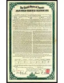 It authorized immediate payments to anyone due less than $50.[3] The estate of a deceased veteran could be paid his award immediately if the amount was less than $500.[4] All others were awarded an "Adjusted Service Certificate," which functioned like an insurance policy. Based on standard actuarial calculations, the value of a veteran's certificate was set as the value of a 20-year insurance policy equal to 125 percent of the value of his service credit. Certificates were to be awarded on the veteran's birthday no earlier than January 1, 1925, and redeemable in full on his birthday in 1945, with payments to his estate if he died before then.[5] Certificate holders were allowed to use them as collateral for loans under certain restrictions.[6]