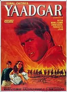 Yaadgar is a 1970 Hindi film produced and directed by S. Ram Sharma. The film stars Manoj Kumar, Nutan, Pran, Prem Chopra, Madan Puri , Kamini Kaushal and Rajnath as a villager. The music is by Kalyanji Anandji. This film has some very memorable songs.