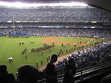 The front office staff vacated the premises on January 23, 2009.[34] Demolition began in March 2009 with the removal of the playing field.[35] On May 13, 2009, the process of removing seats began and was completed on June 8.[36][37] On September 3 and 4, the iconic white facade was dismantled.[38][39]
